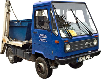 Mit unserem Mulitcar übernehmen wir den Transport von Kleincontainern von 1 - 2,5 m³, mit dem Bauschutt und ähnliches abgefahren wird. Außerdem liefern wir Sand, Kies und Schotter.
